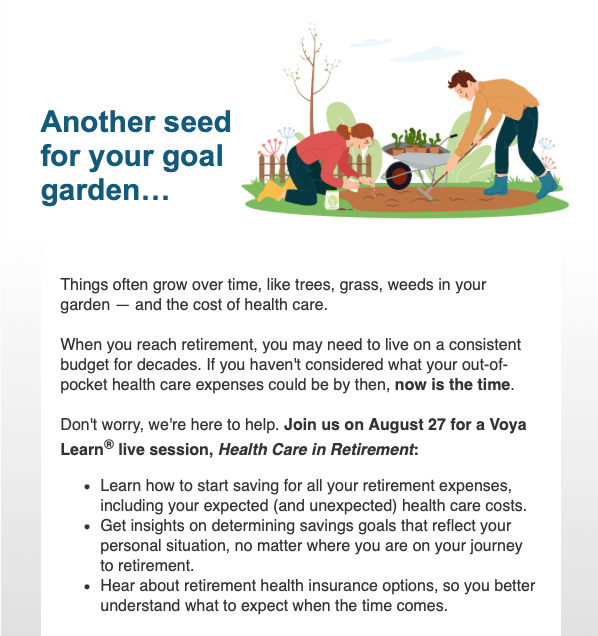 Each email in the series highlighted actionable opportunities, such as logging into their retirement account to explore a suite of financial tools and resources or attending a live webinar focused on improving financial literacy.
